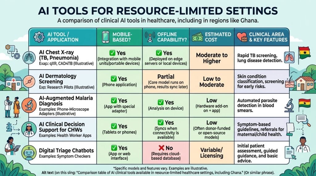 Many of the most capable AI clinical tools were designed for well-resourced environments — stable internet, modern EHR systems, high-specification devices. In Ghana and similar settings, practical adaptations are essential: